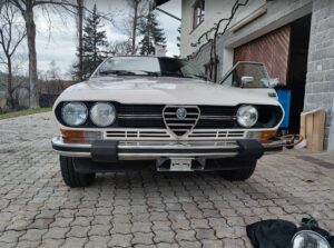 Währenddessen hat dann auch ein Freund mir geholfen, und hat das Endrohr vom Auspuff aufgefrischt (oberflächlichen Rost entfernen und lackieren). Gleichzeitig hat er auch die hinteren Kennzeichenleuchten herausgenommen für eine Reinigung, hier war aber auch schnell klar, das diese auch ausgetauscht gehören, das Glass ist schon komplett verbleicht. Zum Schluss hat er noch den Alfa Romeo Schriftzug in Chrom herausgenommen und poliert.