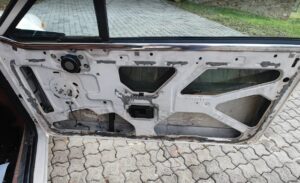 Außerdem habe ich dann auch schon angefangen an der Beifahrertür die Teile zu entfernen damit ich die Wasserabweiser austauschen kann. Diese sind an der Chrom Zierleiste befestigt, weshalb ich erst mal die Türverkleidung entfernen musste. Dies ist mit ein paar Schrauben relativ einfach zu entfernen, ich hatte dies vor sehr vielen Jahren schon mal gemacht um die alten Lautsprecher zu tauschen, deshalb war dies auch für mich kein Problem. Allerdings merkte ich schnell das hier noch mehr zu entfernen ist, wenn ich alle Chromleisten runternehmen und die Wasserabweiser tauschen wollte. Ich realisierte das ich hierfür tatsächlich das Fenster als solches weiter nach unten bekommen muss, weshalb ich es aus der Stahlseil Führung nehmen musste. Dann nach konnte ich die Chromleisten versuchen runter zu bekommen, diese sind mit nieten an der Tür befestigt, also mussten diese mit einen Bohrer aufgeschraubt werden. Trotzdem bekam ich beide Chromleisten nicht komplett ab, da sie beim Drei Eckfenster auch noch festgemacht sind, und zu diesen Zeitpunkt wollte ich diese Fenster nicht deinstallieren, weil ich auch noch gar nicht wusste wie das geht. Für das Austauschen zumindest der Wasserabweiser war dies allerdings auch nicht notwendig, aber was ich allerdings vor mir sah waren viele kleine rostige stellen verteilt über die ganze Tür, somit war klar das ich hier noch mehr Arbeit vor mir hatte.
