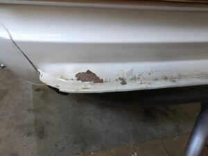 Ich habe nun erstmal auch die hintere Stoßstange runtergenommen, weil auch hier die Aufnahmen bzw. kleinere Stellen hinter der Stoßstange verdächtig nach Rost aussahen. War ich zwar nicht mehr so überrascht von Rost hat es mich hier aber doch etwas gewundert, wieviel Rost auf der hinteren Lippe hinter der Stoßstange war. Also entfernen des Rosts was technisch möglich war (interessant ist das in dieser Lippe innen eine art weiches Füllmaterial ist) und mit Rostumwandler erstmal behandeln.