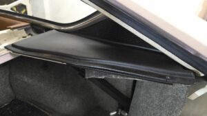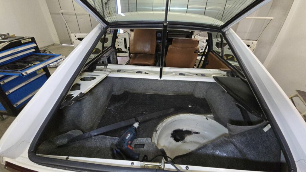 Nach dieser nicht wirklich schönen Überraschung ging es also endlich an die hinteren Fenster. Auch hier war aber allein die Vorbereitung um überhaupt diese rauszubekommen schon sehr groß, aber der Reihe nach. Erstmal die hintere Sitzbank & Lehne raus, hier hatte ich schon gut Erfahrung mit. dann kann schon mal die zweiteilige Seitenverkleidung runtergenommen werden. Dann musste aber auch die Kofferraum Abdeckung raus damit man den letzten Innenraum Verkleidung Teil im hinteren Dreieck vom Fenster entfernen kann. Das muss alles raus, da auch hier die Nieten versteckt sind welche die Chromleisten festhalten.