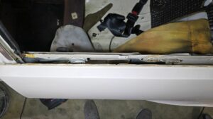 Heute ist der Plan tatsächlich auch bei den hinteren Scheiben die Chromleisten zu entfernen um auch hier die Wasserabweiser und Führungen zu tauschen. Angefangen habe ich aber doch noch mit ein paar neuen Tools bei der linken vorderen Tür wo im Falz ziemlich viel Rost war. Ich habe jetzt auch den Falz auseinandergedrückt um auch den letzten Rost dort noch zu versuchen mechanisch zu entfernen.