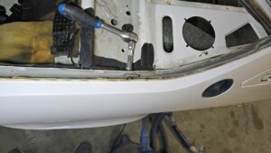 4 Schrauben hielten also die Kofferraum Abdeckung fest, aber diese letzte Verkleidung auf den Seiten des Kofferraumes war natürlich genietet, also mussten diese mit dem Bohrer vorsichtig entfernt werden. Interessanterweise fanden sich darunter Aussparungen für Lautsprecher, wieder was gelernt.
