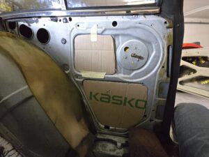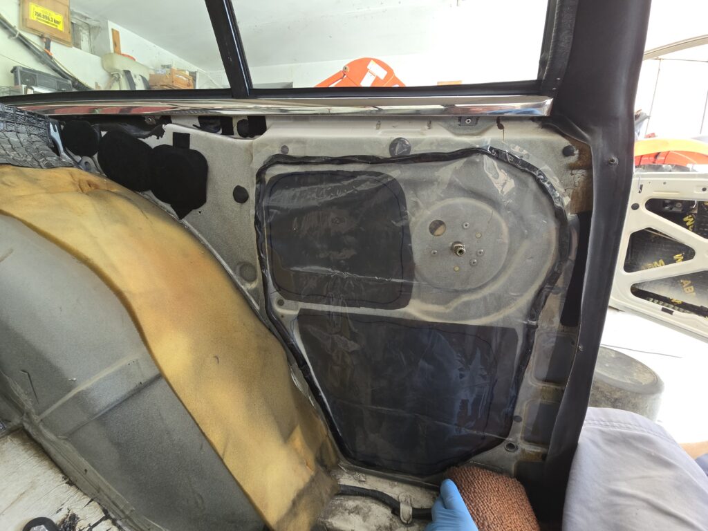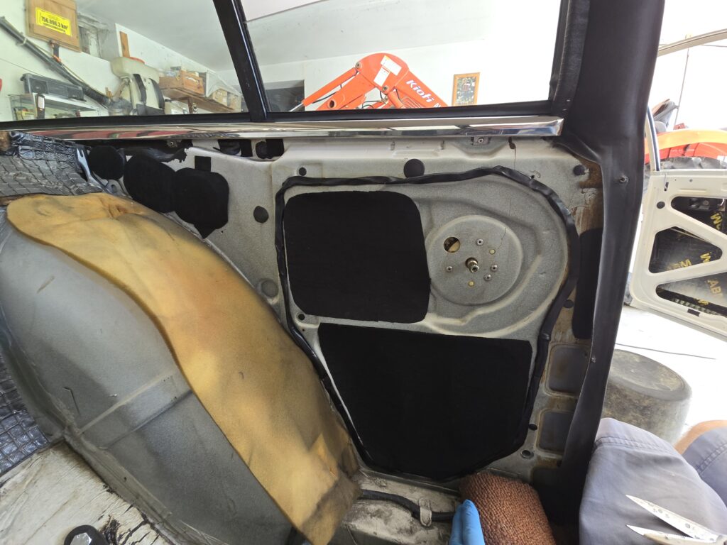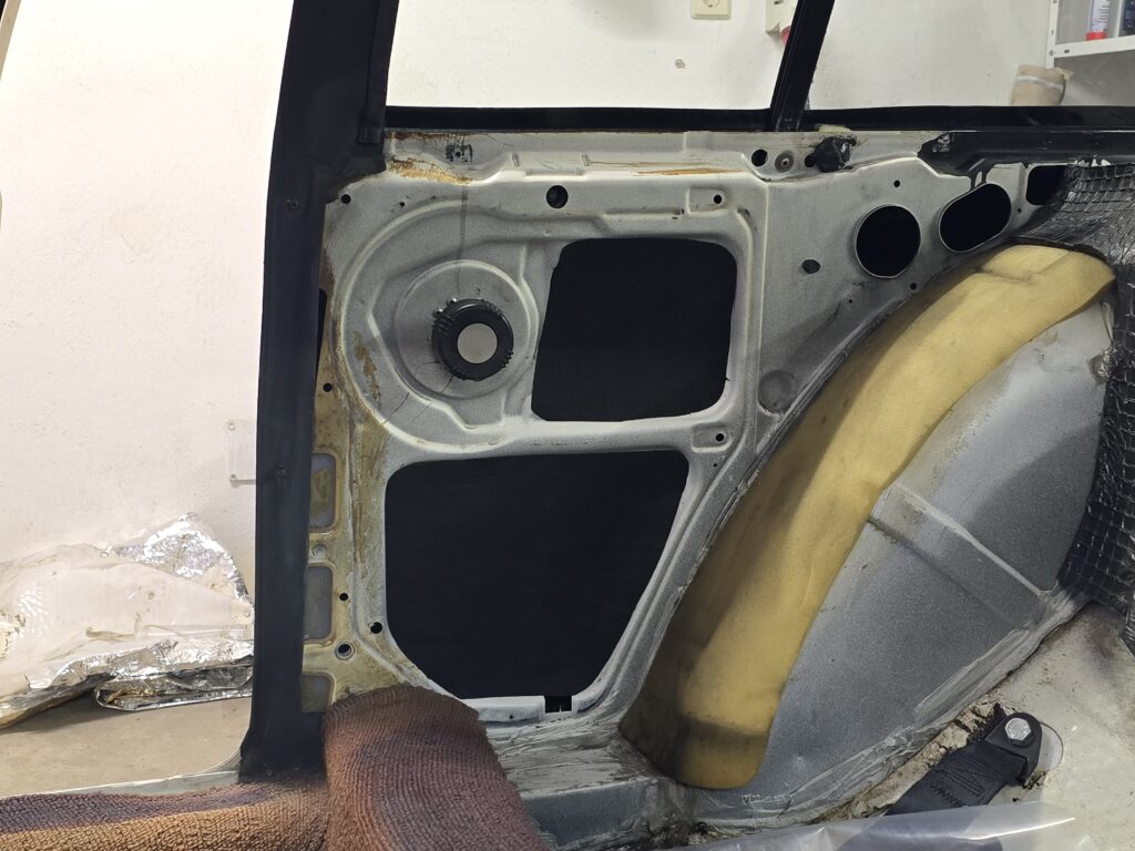 dH. jetzt werden die hinteren inneren Elemente zugemacht. Vorher hatte nur eine Folie mit einer Butyl Schnur das ganze zugedeckt. Die Folie hatte ihre Aufgabe getan also habe ich eine neue besorgt, hierfür hatte ich eine normale Polyethylen Folie besorgt die 0.3 mm dick war. Aber irgendwie störten mich die großen Löcher in der Seitenwand (als auch bei den Türen) weshalb ich mir kurzfristig überlegte diese ebenfalls gesondert zu schließen. Hierfür wiederum habe ich eine 2mm selbstklebende Filzmatte besorgt. Muss man das machen? Nein, aber ich dachte, „Hilft’s nichts, schadet’s nichts“!