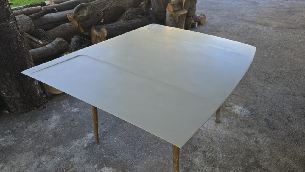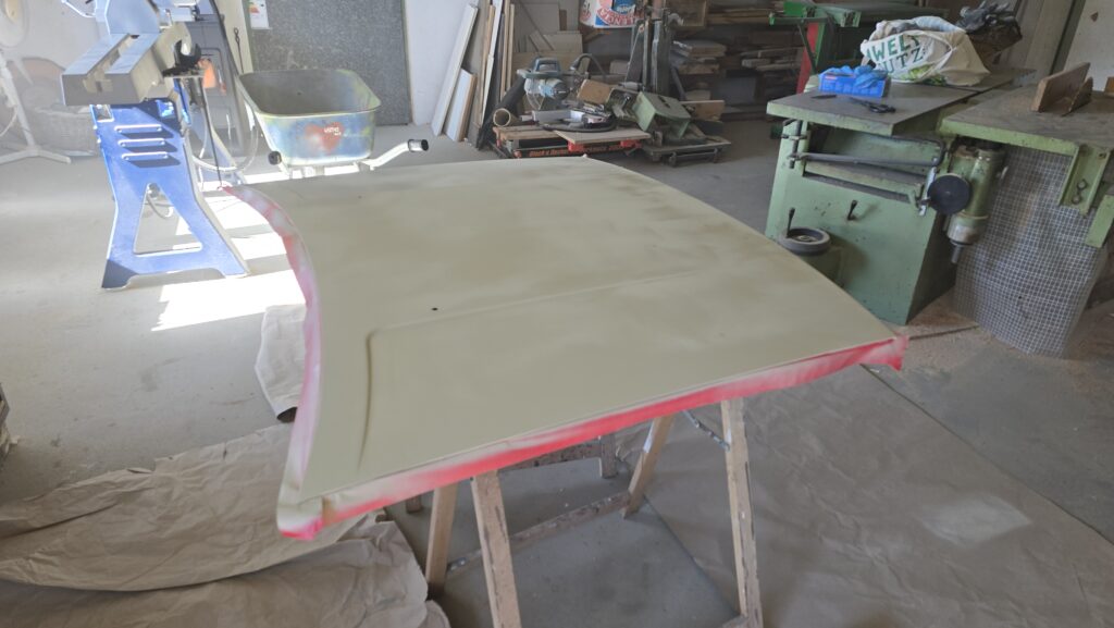Also habe ich die Motorhaube demontiert und auf ein Gestell gegeben und erstmal grob und dann fein abgeschliffen. die eigentlichen kleinen Löcher habe ich etwas stärker behandelt und mit Fein Spachtel bzw. Füller ausgebessert.